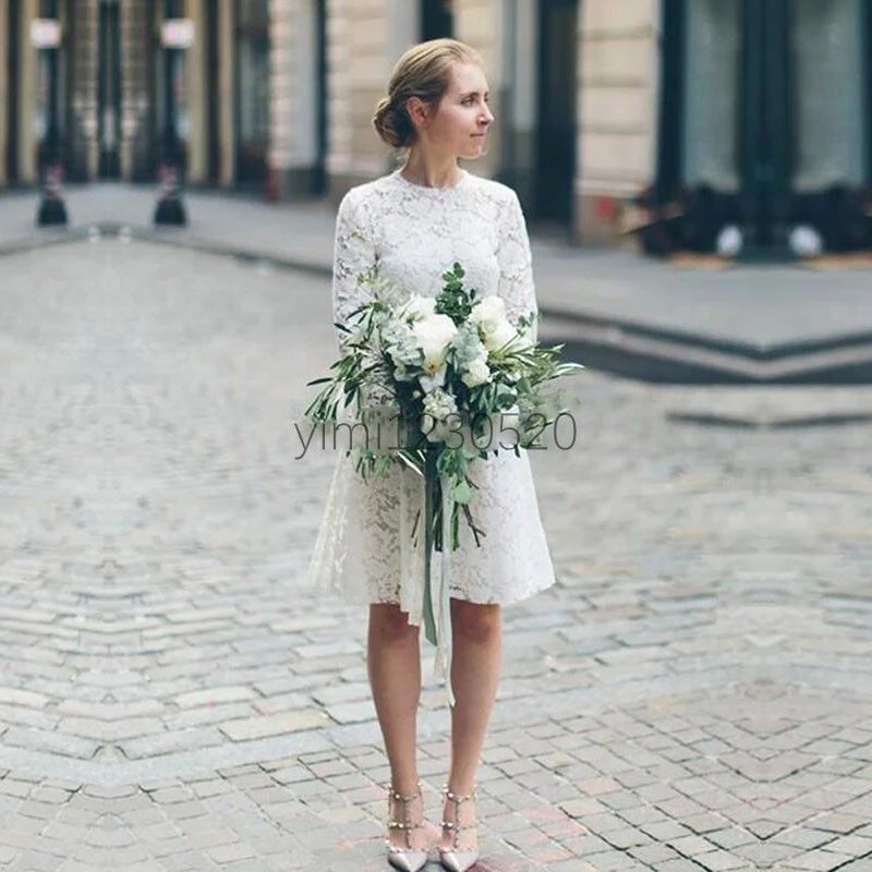 Ivory Short Bridesmaid Dresses Jewel Long Sleeve Knee Length Lace