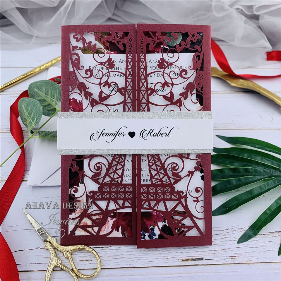 Splendid Burgundy France Theme Tower Laser Cut Wedding Invitations