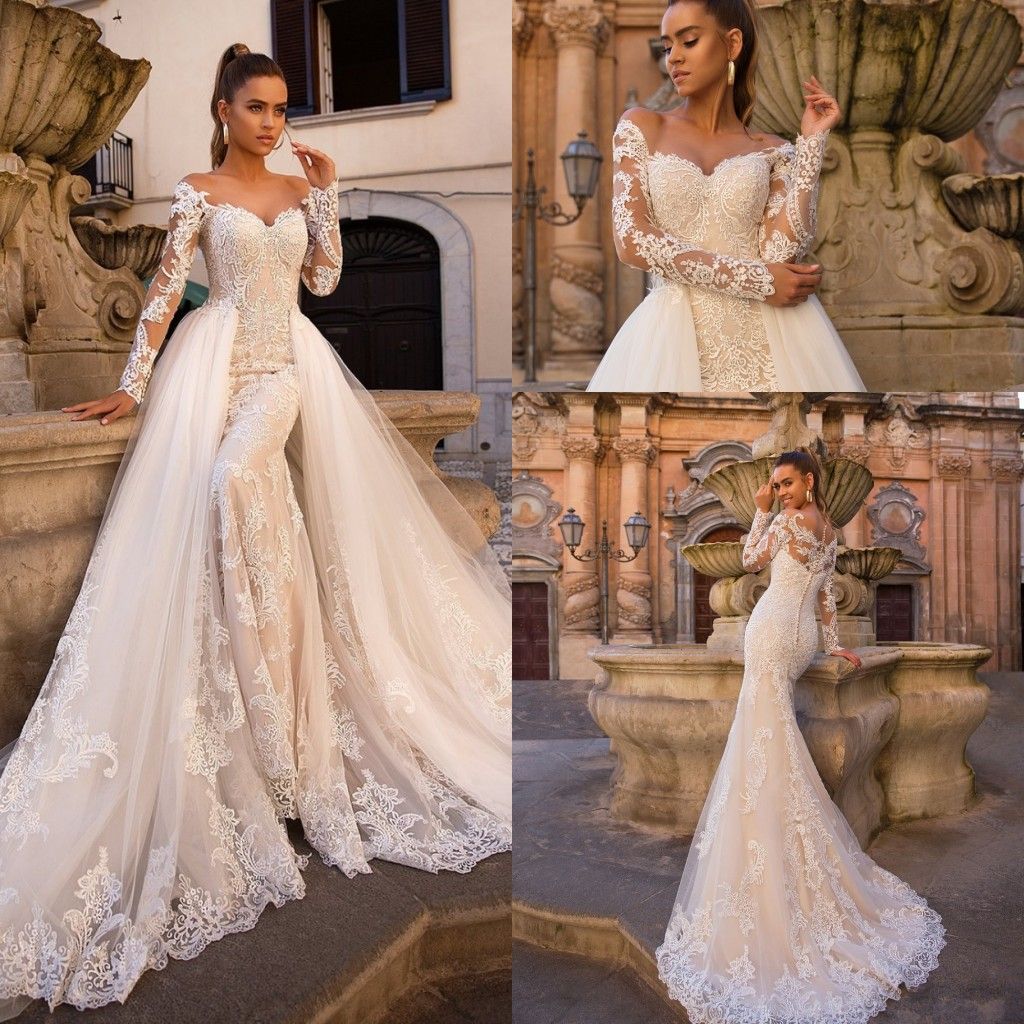 Champagne Lace Mermaid Wedding Dresses 2020 Sheer Tulle Long